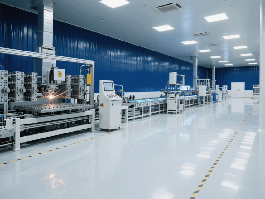 智能控制系統(tǒng)集成環(huán)境監(jiān)測、設(shè)備聯(lián)動和MES數(shù)據(jù)看板,深藍墻面上嵌裝LED智能顯示屏,實時反饋生產(chǎn)數(shù)據(jù)。激光焊接區(qū)配備黃光防眩照明,工作站外圍設(shè)置淺灰環(huán)氧樹脂警示帶。整體設(shè)計通過冷色調(diào)的科技美學與自動化產(chǎn)線的有機結(jié)合,構(gòu)建高效可靠的光伏材料智能制造空間。