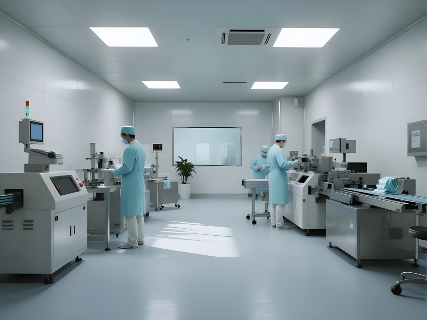 本潔凈車間設計采用現(xiàn)代工業(yè)極簡風格,強調(diào)功能性與潔凈度。主色調(diào)選用淺灰藍(墻面)與純白(頂面)的搭配,營造冷靜專業(yè)的氛圍,局部用淡綠色做視覺緩沖。