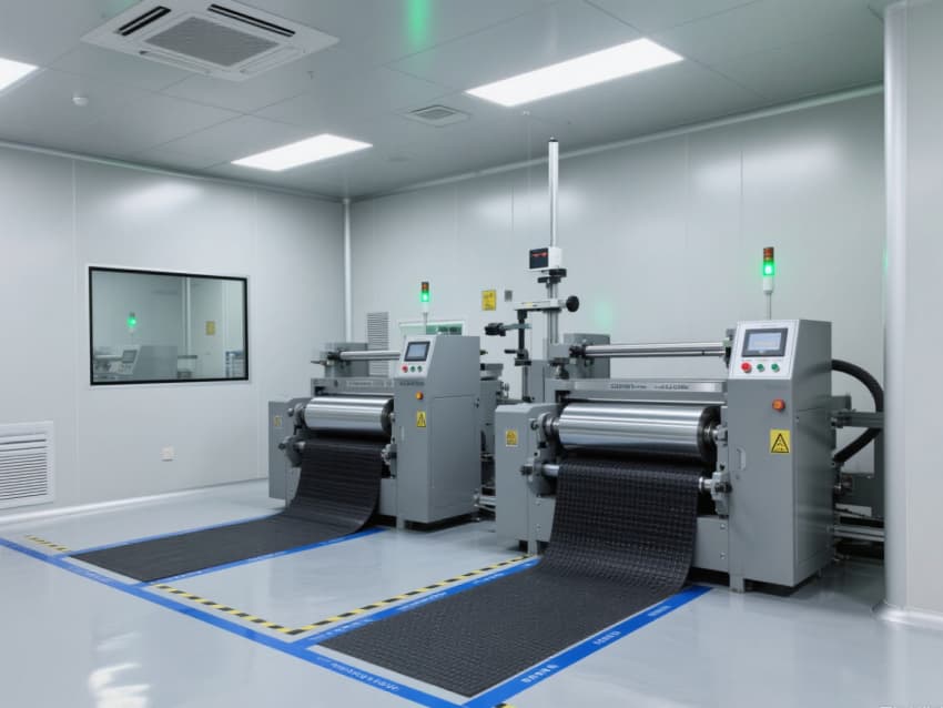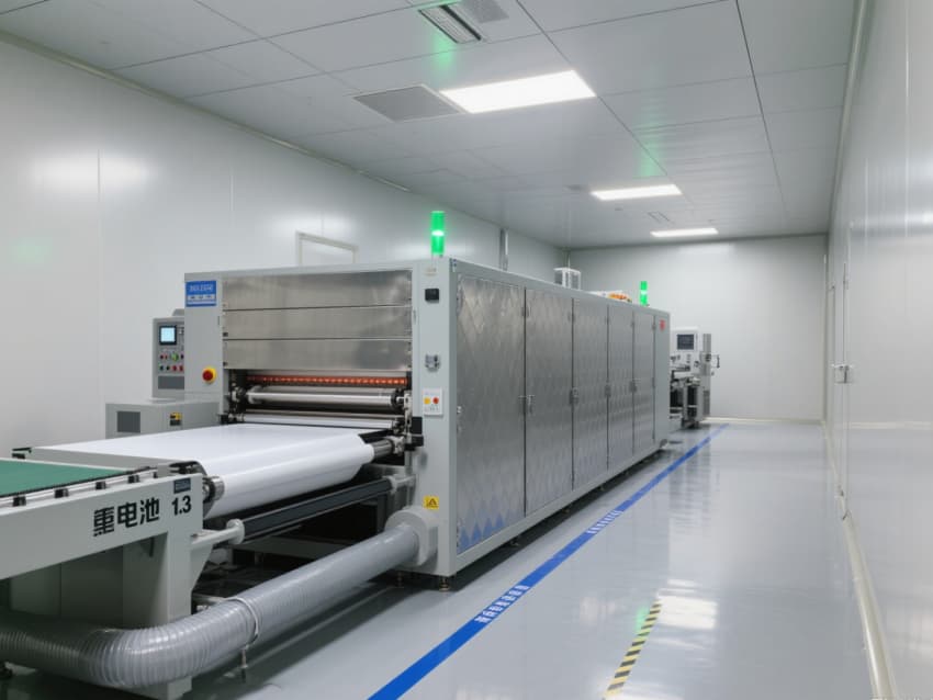 車間以銀灰色抗菌金屬彩鋼板搭建墻體與吊頂,搭配淺灰色防靜電環(huán)氧地坪,金屬質(zhì)感的建材兼具抗電解液腐蝕、易清潔特性,地面藍(lán)色防靜電標(biāo)識線清晰劃分涂布、卷繞、裝配等工序區(qū)域。頂部高效過濾器與定向?qū)恿飨到y(tǒng),實現(xiàn)每小時18-22次空氣置換,配合除濕機組將濕度精準(zhǔn)控制在20-30%RH,避免水分影響電芯性能。?