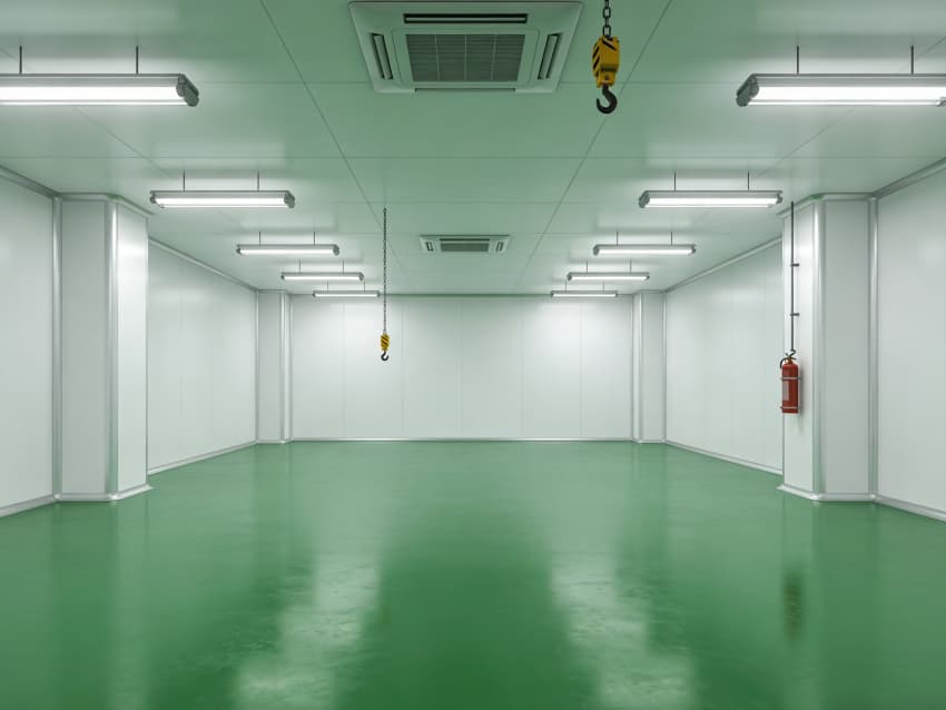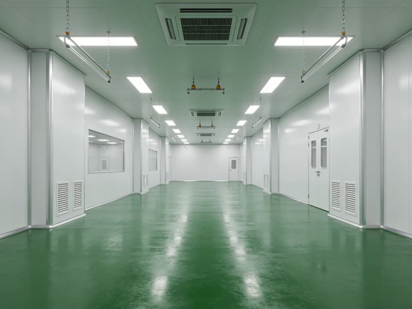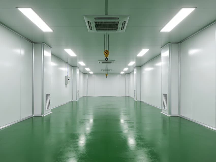 航天航空零件生產車間內部施工以“超高精度、極致潔凈、抗擾穩定”為核心,采用系列尖端工藝技術,適配精密零件加工的嚴苛要求,同時實現地面綠色、墻壁白色的統一風格。地面采用綠色防靜電耐磨環氧自流平工藝,經基層拋丸強化、高滲透界面劑處理、環氧砂漿精準找平、自流平罩面固化四道核心工序,表面平整度誤差控制在0.5mm/m內,防靜電性能達10?-10?Ω,抗壓強度超C40,可耐受精密設備碾壓與切削液侵蝕。