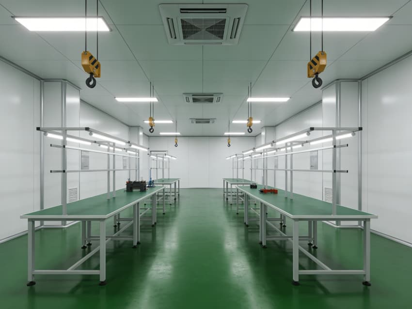 墻面采用白色食品級潔凈抗菌涂層施工,推行無縫拼接與高精度找直工藝,陰陽角采用R50圓弧倒角處理,杜絕積塵死角,涂層附著力達2.5MPa,硬度≥2H,可耐受高頻次潔凈消殺與工業粉塵防護。各功能區域針對性實施專項工藝:核心加工區地面增設多層阻尼減震墊層,采用浮筑地面施工技術,有效隔絕振動干擾;檢測區墻面做保溫隔熱一體化處理,預留精密儀器專用管線預埋孔,確保恒溫恒濕環境穩定;裝配區采用防靜電接地網格預埋工藝,保障零件裝配過程靜電安全。
