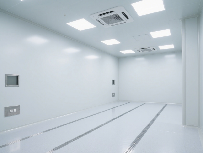 效果圖從多視角展現關鍵設計:正面全景圖呈現開闊無設備空間,預留充足布局靈活性;角落特寫聚焦墻面與地面無縫拼接工藝、圓弧收邊處理,規避積塵死角;側視圖清晰展示頂部十萬級高效送風口、回風夾道與壓差計,直觀傳遞潔凈控制核心;局部細節圖則凸顯地面防靜電環氧涂層的細膩質感,契合電子元件生產防護要求。?