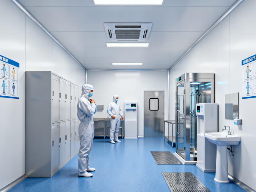 凈化配套設計全面:藍色地面具備抗菌、易消殺特性,配合地面導坡設計加速清潔排水,減少污漬殘留;白色墻面采用無縫抗菌涂層,消除清潔死角,降低微生物附著風險;全車間劃分獨立凈化分區,通過壓差控制預留設計隔絕不同潔凈等級區域,人流、物流通道分離避免交叉污染,全方位保障無菌生產環境穩定達標。