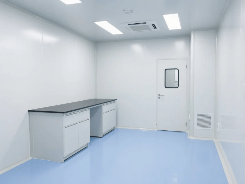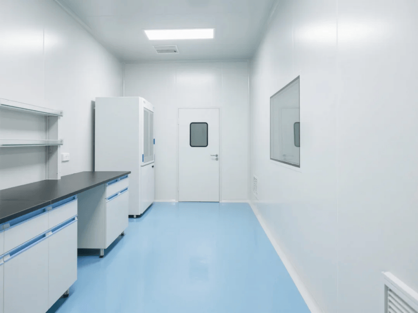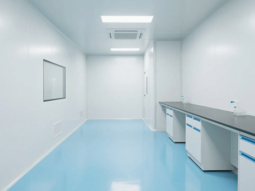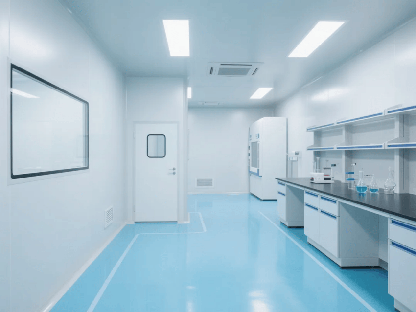 本方案采用生物科技極簡風格,嚴格遵循ISO14644-1Class6潔凈標準。空間以純白抗菌彩鋼板墻體與淺藍環氧樹脂地坪構建主體框架,營造純凈、高效的檢測環境。墻體采用50mm厚醫療級抗菌彩鋼板,所有接縫處采用R30mm圓弧處理工藝,確保無衛生死角。淺藍環氧地坪添加防滑顆粒,摩擦系數≥0.6,同時具備優異的耐化性。