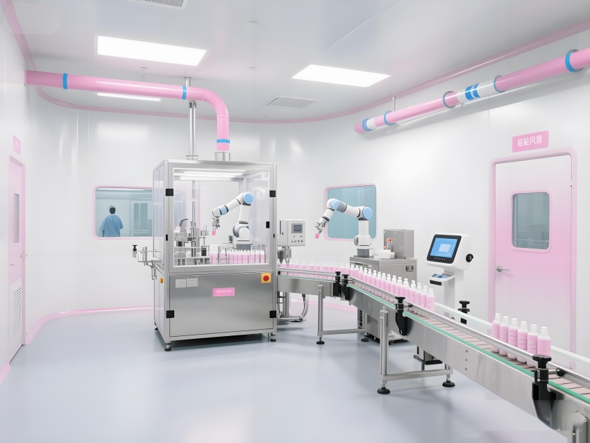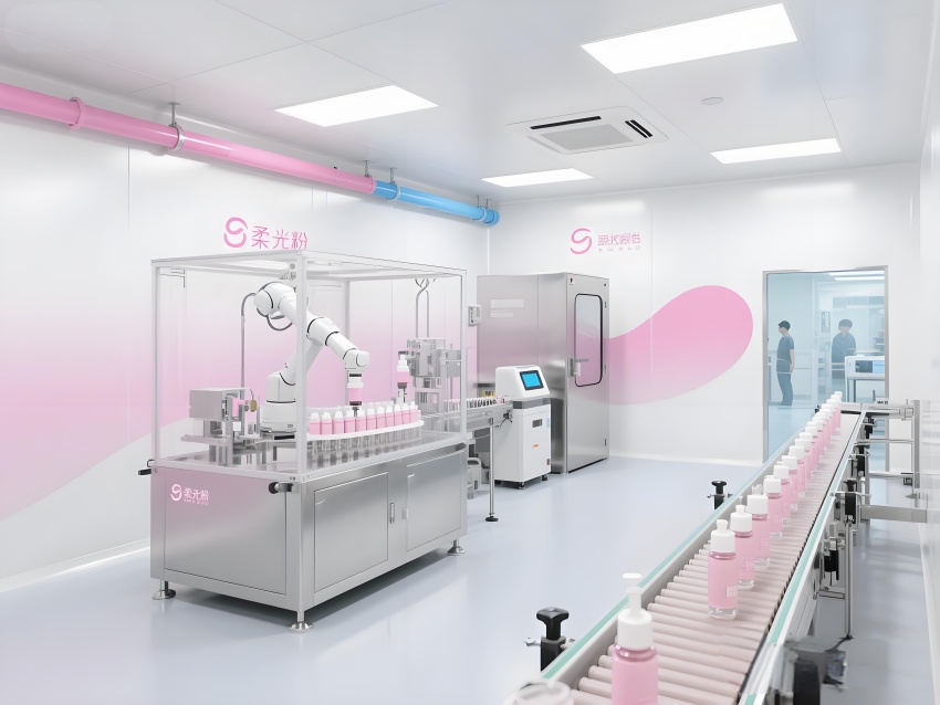 本車間以“科技感純凈美學”為設計語言,將化妝品行業的精致基因融入工業空間。純白主色調搭配品牌標志性的柔光粉點綴,墻面圓弧過渡的彩鋼板與地面淺灰導靜電地板構成潔凈基底。核心灌裝區透明層流罩內,機械臂精準抓取瓶體灌裝,冷銀色設備與粉色功能標識形成視覺對比。頂棚均勻分布的LED平板燈在乳化區投下無影光效,原料輸送管道通過色環編碼清晰區分。質檢實驗室的藍光檢測儀與包裝區高速傳送帶上的產品流,共同構建高效生產韻律。人員通道的智能風淋室采用漸變色玻璃,科技感與人性化并存。整體空間通過嚴格的功能分區與柔和的色彩管理,打造符合國際標準的化妝品智造殿堂。