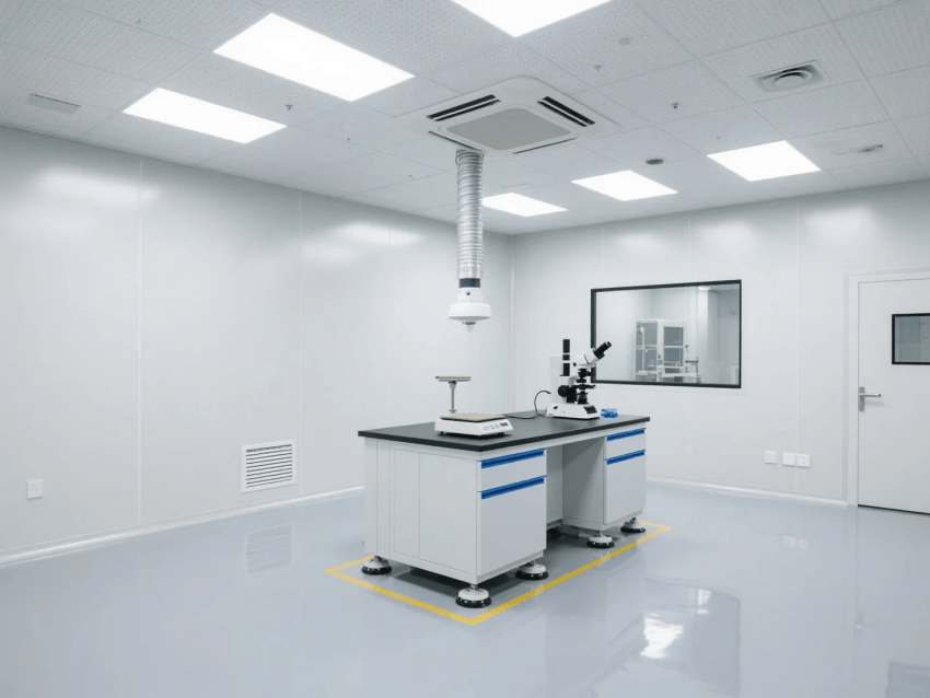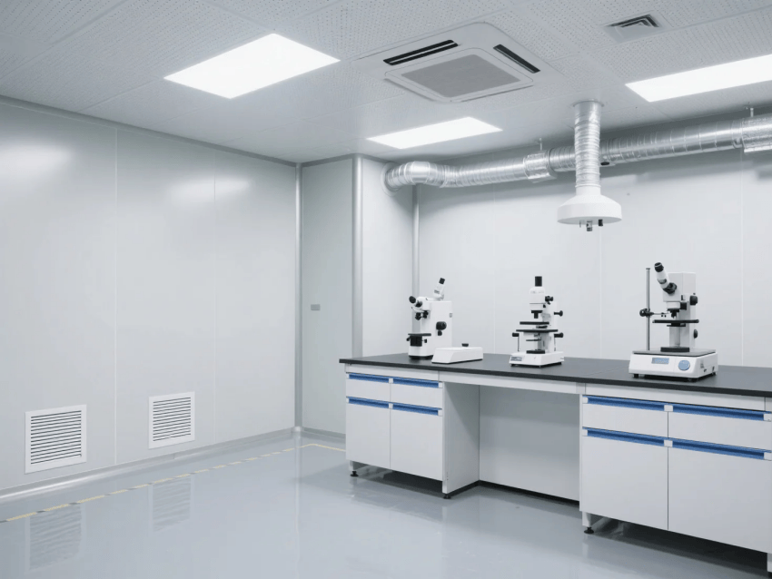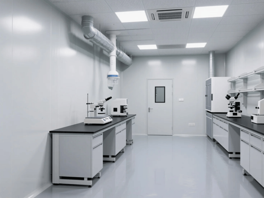 本方案采用高級灰與純白作為主色調,打造嚴謹專業的實驗環境。墻面選用50mm厚聚氨酯保溫彩鋼板,表面覆有抗菌涂層,接縫處采用無縫焊接工藝處理。地面鋪設2mm厚環氧自流平地坪,具有優異的耐化學腐蝕性能,灰白相間的分區標識既美觀又實用。