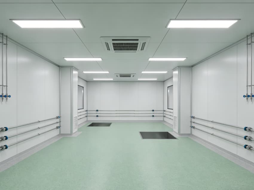 車間內部施工工藝凸顯專業優勢:地面采用淺綠色環氧自流平施工工藝,經基層打磨、界面處理、環氧砂漿找平、自流平罩面四道工序,表面平整度誤差≤1mm/m,兼具抗菌、抗化學腐蝕特性;墻面采用白色潔凈抗菌涂層施工,推行無縫拼接工藝,陰陽角采用圓弧倒角處理,杜絕清潔死角,涂層附著力達1.5MPa以上,滿足頻繁消殺需求。