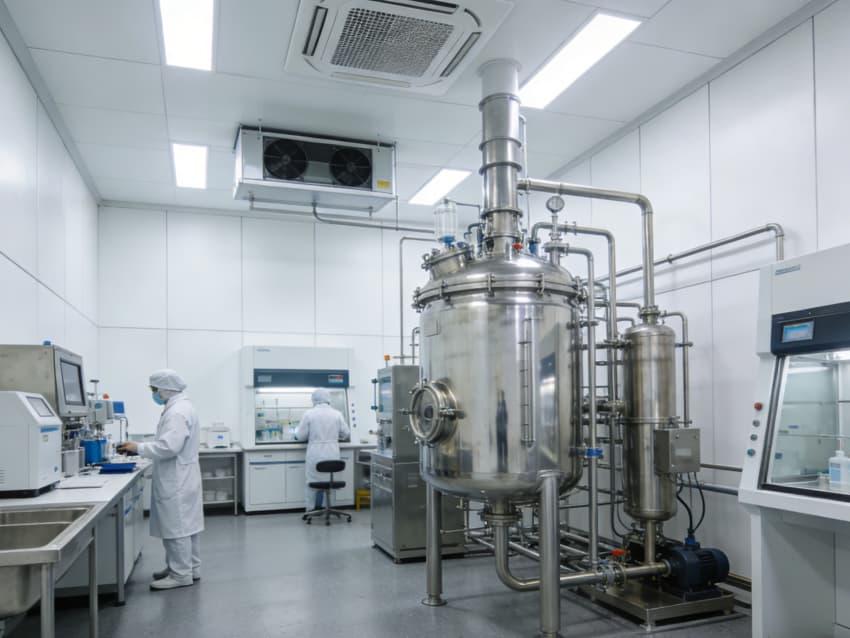 白色墻面采用食品級潔凈抗菌涂層,推行無縫拼接工藝,陰陽角圓弧倒角設計消除清潔死角,潔凈度可達Class 7級標準。車間科學劃分抗體表達區、偶聯反應區、純化區等功能區域,各區域配備獨立層流凈化與負壓防護系統,偶聯區預留精密溫控與惰性氣體接口,純化區設置無菌物料傳遞窗口,全方位規避交叉污染,保障研發生產的安全性與合規性。