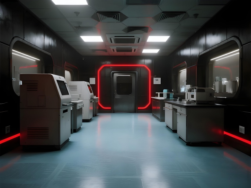 本實驗室采用"生物防御未來主義"風格,通過銳利的幾何切割與警示色彩構建科研防護美學。核心實驗區以啞光黑墻面搭配紅色應急光帶,形成視覺危險預警,與清潔區的冰藍色環氧樹脂地面構成強烈功能區分。設備區的金屬原色與透明PCR儀散熱孔展現工業精密感,天花板的六邊形送風單元與地面導流孔形成垂直氣流可視化。防爆玻璃觀察窗嵌入電子壓差顯示屏,氣閘室的黃色斜紋標識強化生物安全等級過渡。通過冷白光與設備界面藍光的層疊照明,在滿足BSL-2物理防護要求的同時,營造出科幻電影般的嚴謹科技氛圍,傳遞基因工程特有的精密與危險并存的特質。